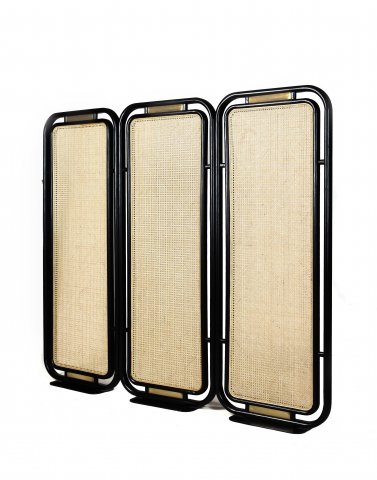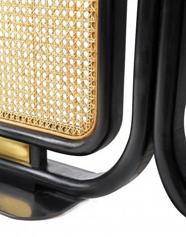 Solid Indonesian sungkai wood feet and seat with dowel joints feet black paint finish, unfilled pore, satin sheen. Natural rattan weaving details, natural color, steel plate base.